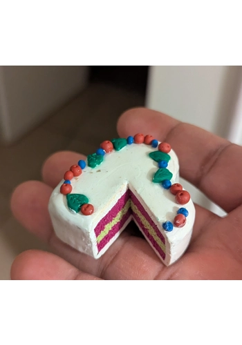 This handmade dollhouse-sized heart-shaped cake is crafted from polymer clay with intricate details, including a fitted slice taken out, showcasing a cute, realistic dessert perfect for your miniature bakery or dollhouse collection. The cake features beautifully painted frosting and layers, all finished with a glossy UV resin glaze for a polished look. Whether you're a fan of miniatures, dollhouses, or kawaii decor, this tiny cake is sure to add a sweet touch to any space!