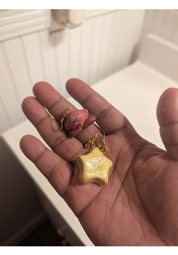 This handmade mismatched earring set features one mini Kirby and one shimmering star, crafted from high-quality Sculpey Premo polymer clay with intricate details and a smooth, glossy finish. Designed for gamers and lovers of all things cute, these lightweight earrings bring a playful, nostalgic charm to any outfit! Whether you’re a longtime Kirby fan, a collector of geeky accessories, or just love whimsical jewelry, this set is the perfect addition to your collection.